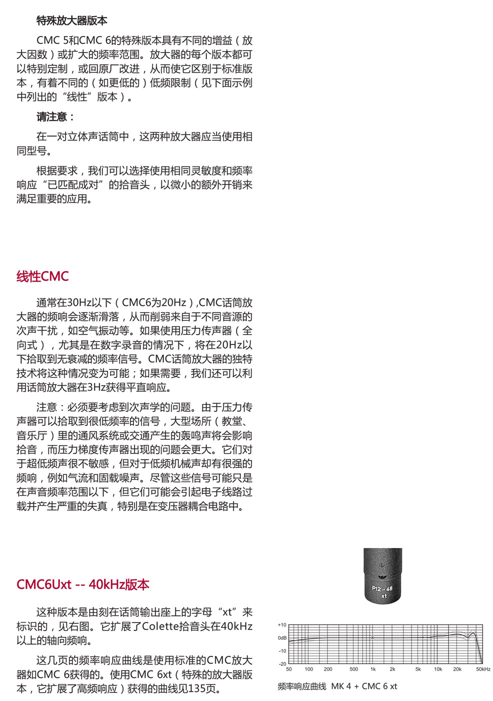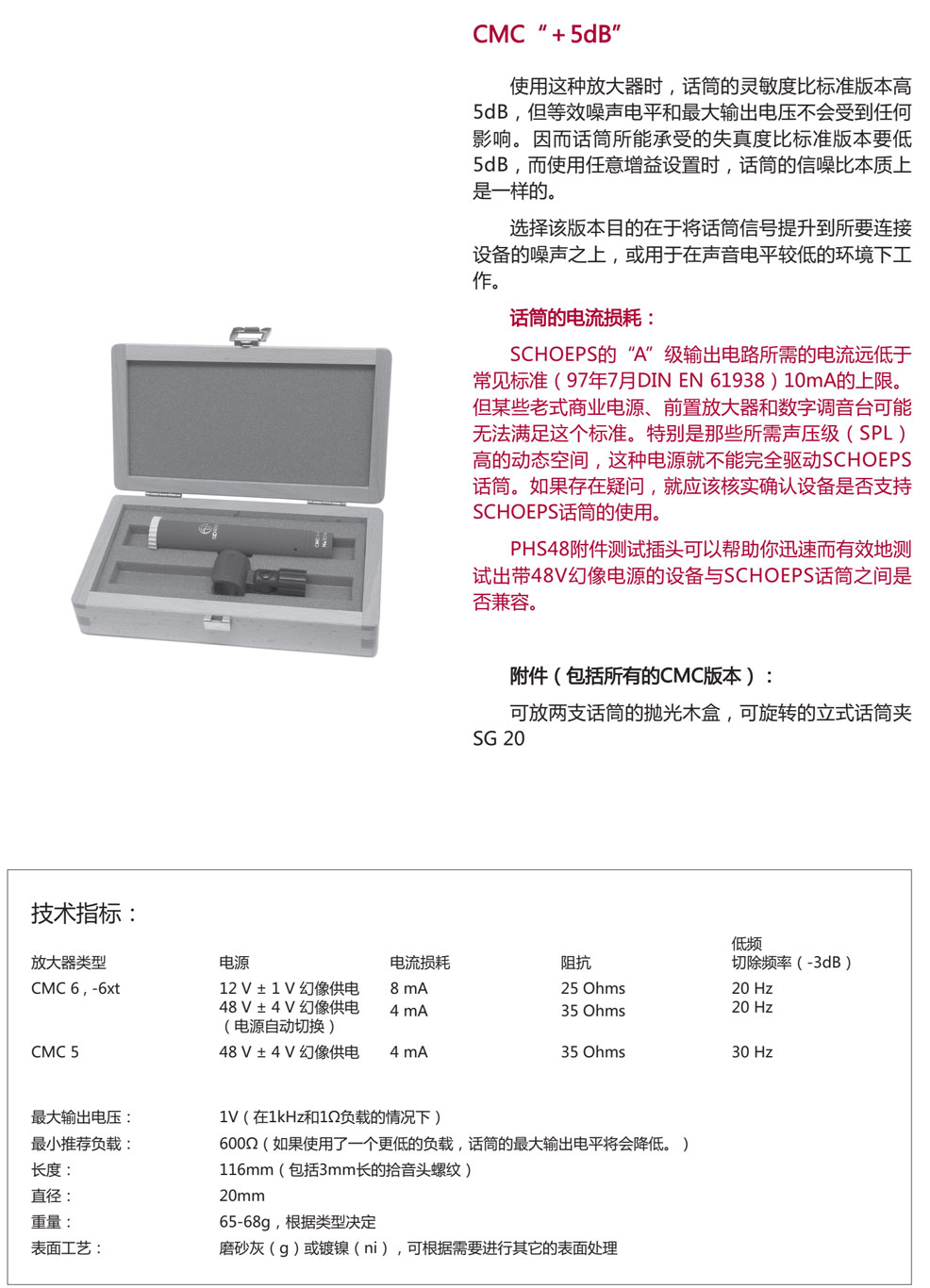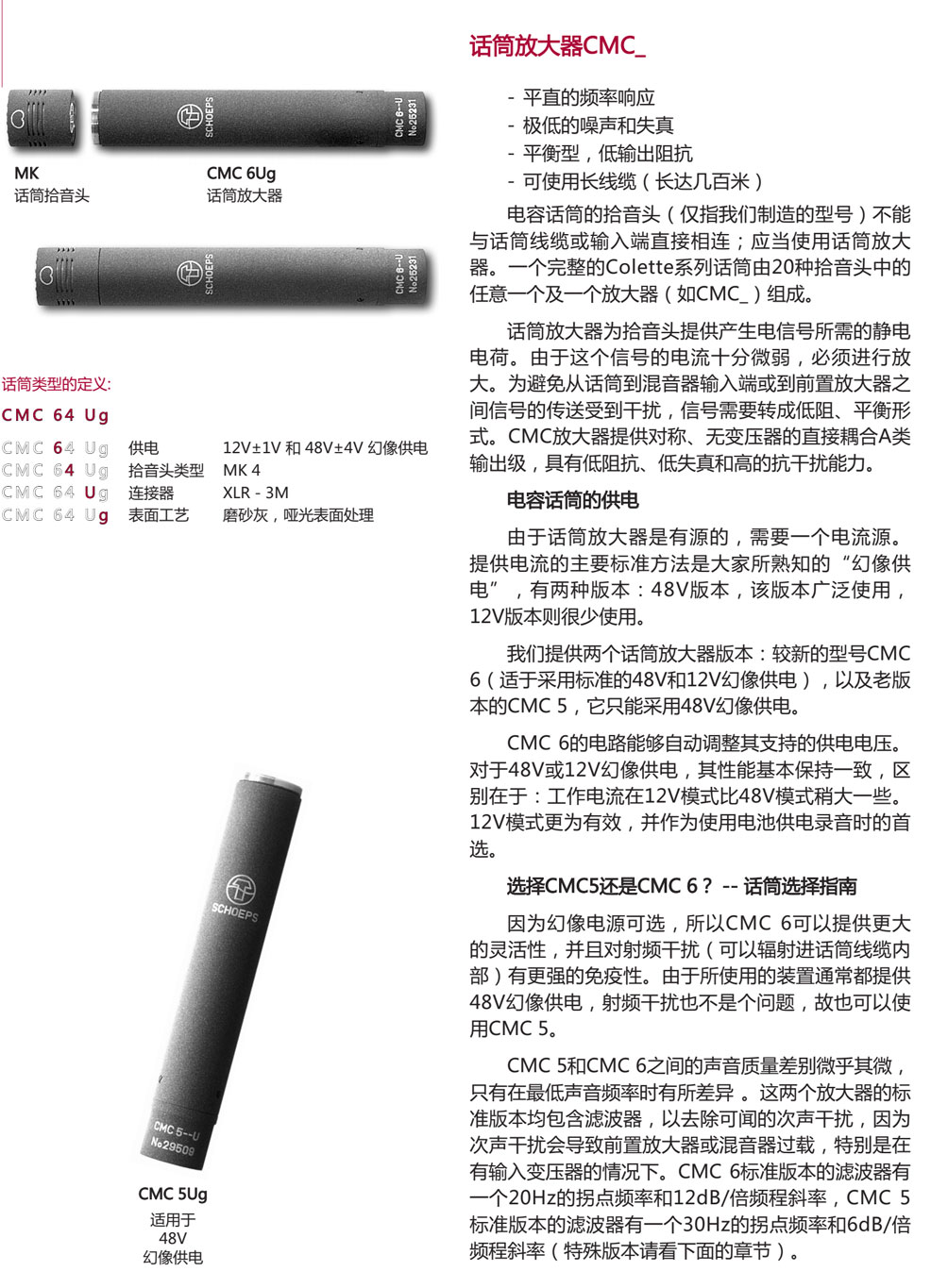话筒放大器CMC6Ug 平直的频率响应,比较低的噪声和失真平衡型,低输出阻抗,可使用长线缆(长达几百米),电容话筒的拾音头(仅指我们制造的型号)不能与话筒线缆或输入端直接相连;应当使用话筒放大器。一个完整的Colette系列话筒由20种拾音头中的任意一个及一个放大器(如CMC_)组成。话筒放大器为拾音头提供产生电信号所需的静电电荷。由于这个信号的电流好微弱,需要进行放大。为避免从话筒到混音器输入端或到前置放大器之间信号的传送受到干扰,信号需要转成低阻、平衡形式。CMC放大器提供对称无变压器的直接耦合A类输出级,具有低阻抗、低失真和高的抗干扰能力。电容话筒的供电,由于话筒放大器是有源的,需要一个电流源。提供电流的主要标准方法是大家所熟知的“幻像供电”,有两种版本:48V版本,该版本广泛使用,12V版本则很少使用。我们提供两个话筒放大器版本:较新的型号CMC6(适于采用标准的48V和12V幻像供电),以及老版本的CMC 5,它只能采用48V幻像供电。CMC 6的电路能够自动调整其支持的供电电压。