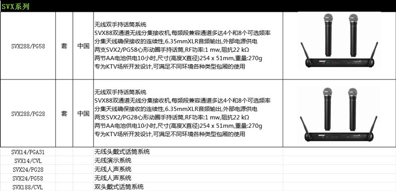 PG58话筒头带SVX2无线手持发射机的无线话筒,专为突出领唱和伴唱人声的清晰度进行了优化,实用性好。