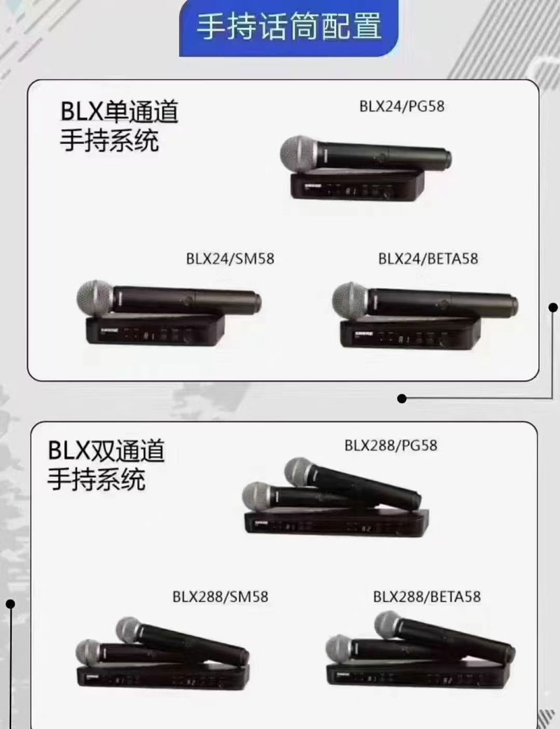 BLX系统兼容多款Shure话筒,您可根据需求随意选择。