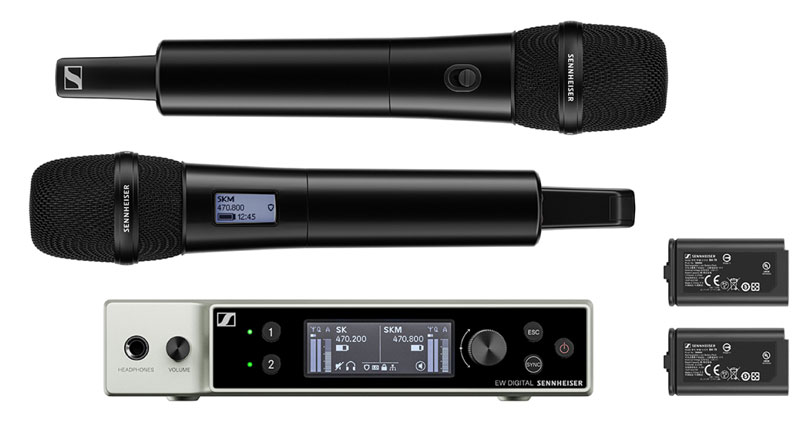 该套件包括2个EW-DX SKM-S(带开关的手持式发射机)、2个MMD 835音头(心形、动圈)、1个EW-DX EM 2机架式接收机(2个通道)和2个BA 70可充电电池。
